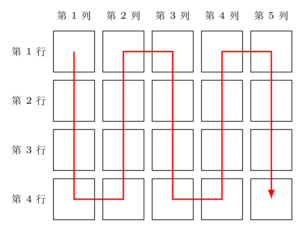 例如,若 n=4,m=5,则所有 4×5=20 名考生将按照 CSP-J 2025 第一轮成绩从高到低的顺序,根据下图中的箭头顺序分配座位。